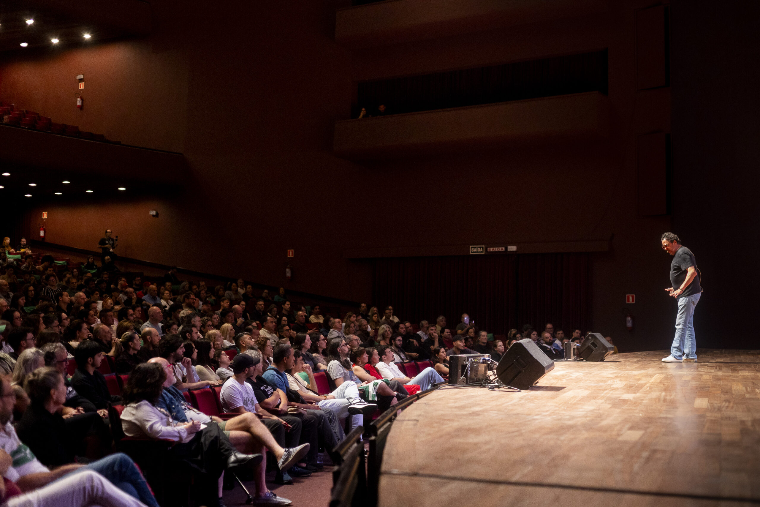 Era impossível não reconhecer a emoção ali, e admito que fiquei atenta ao lance. Algumas histórias vinham com força, como cruzamentos bem feitos que pedem cabeceio. Outras chegavam como passes curtos, reflexivos, quase conselhos. A platéia reagia como torcida que reconhece o ídolo: murmúrios, risos, identificação – e aplausos fora de hora.