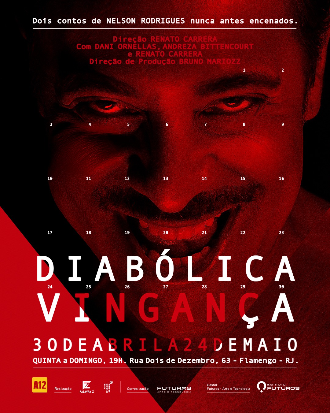 “Diabólica vingança” é a quinta montagem de Carrera baseada em uma obra de Nelson Rodrigues. Entre direção e atuação, ele esteve em “Vestido de noiva” (Prêmio Questão de Crítica de Melhor Espetáculo), “Senhora dos afogados”, encenada por Ana Kfouri; “A serpente” e “A falecida”, dentro do projeto “2 X Nelson”.