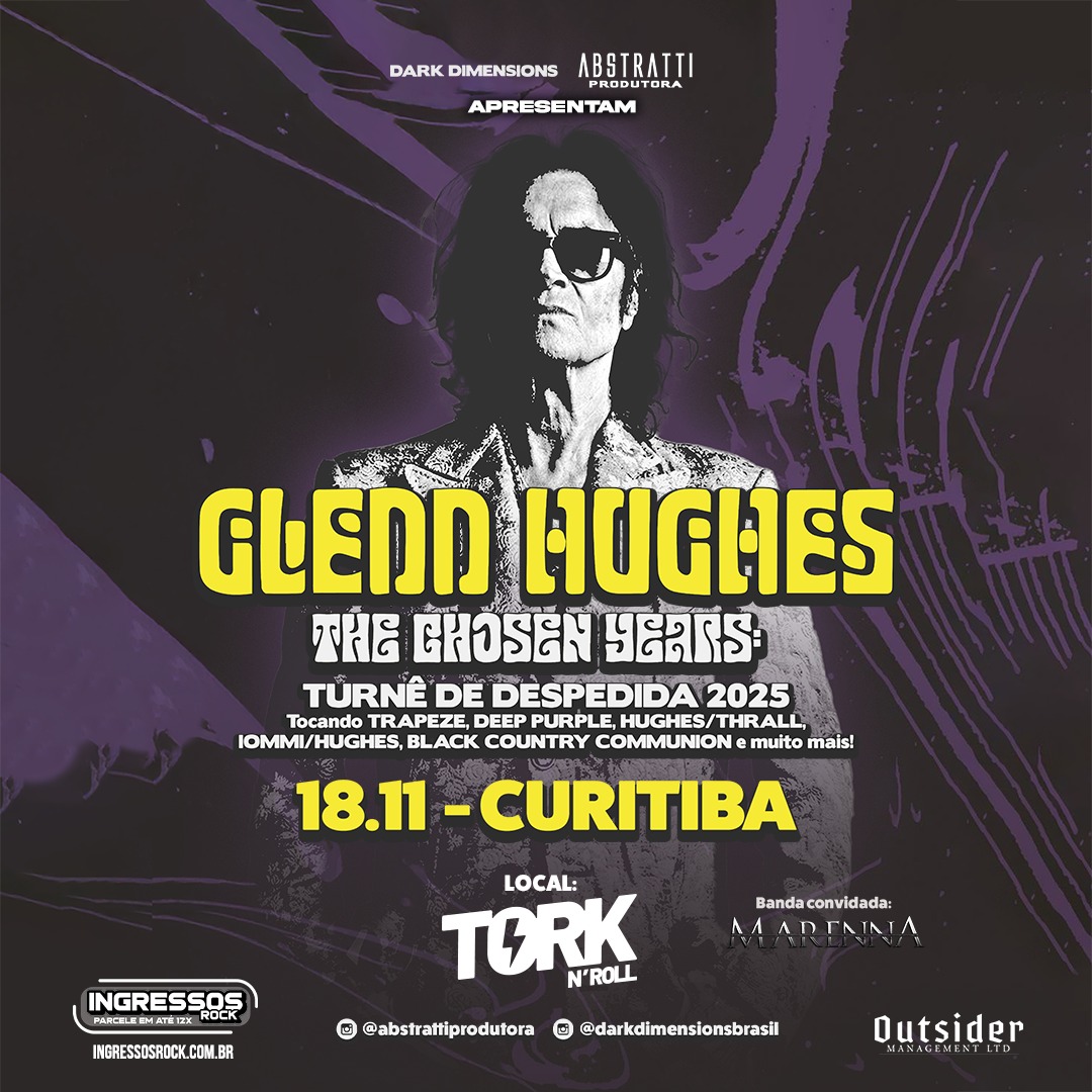 No dia 18 de novembro, o lendário baixista e vocalista Glenn Hughes, eternizado por seu trabalho com bandas como Trapeze, Deep Purple e Black Sabbath, retorna a Curitiba para um show no palco do Tork n’ Roll. A apresentação faz parte da turnê The Chosen Years, que marca a despedida do artista dos palcos e deve contar com os principais clássicos de sua carreira. Os ingressos estão à venda no site da Bilheto e custam a partir de R$179.