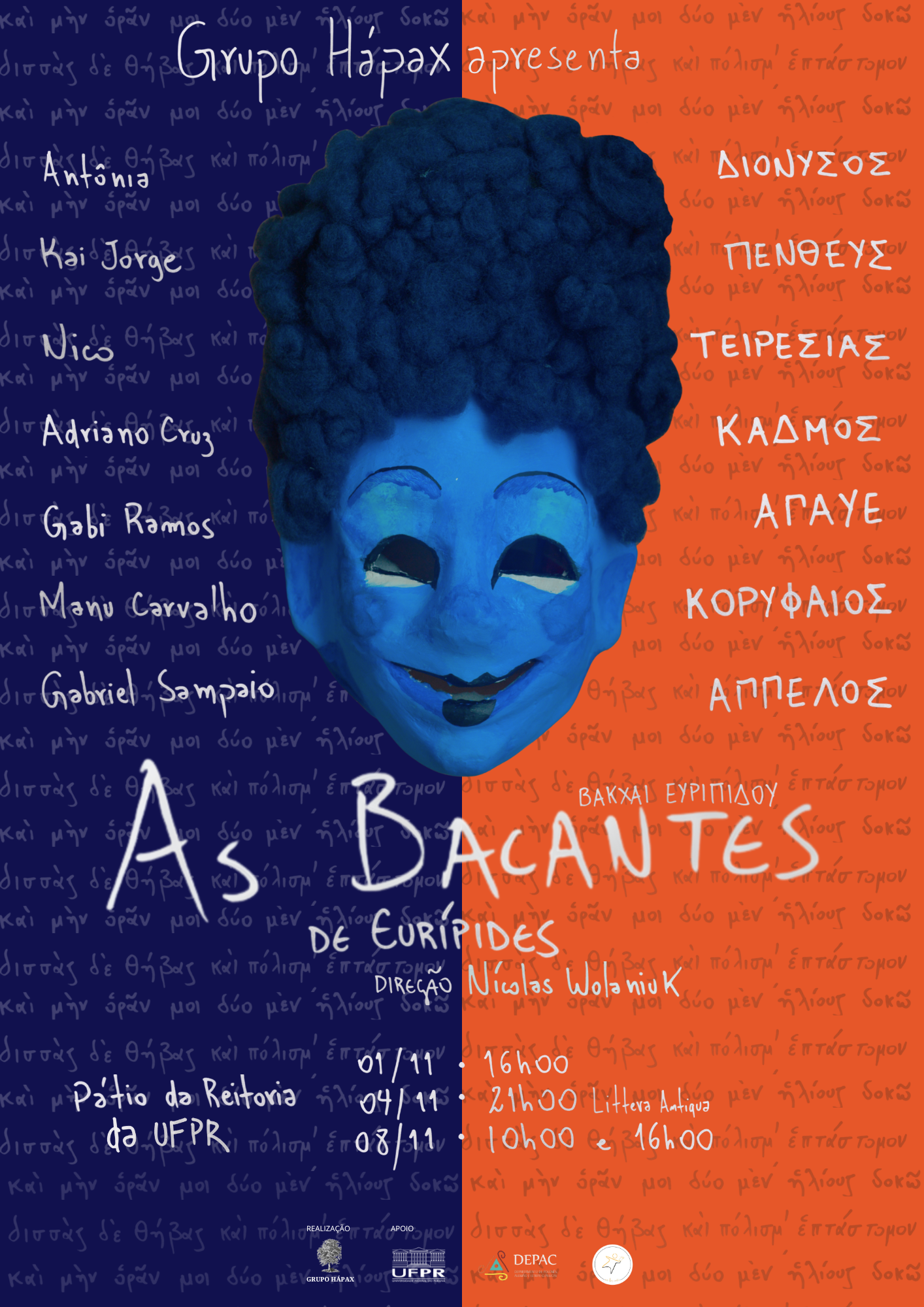 O Grupo Hápax estreia em novembro sua nova montagem: As Bacantes, adaptação da tragédia de Eurípides. As apresentações acontecem no Pátio da Reitoria da UFPR nos dias 1º de novembro, às 16h, 4 de novembro, às 21h, e 8 de novembro, às 10h e às 16h.