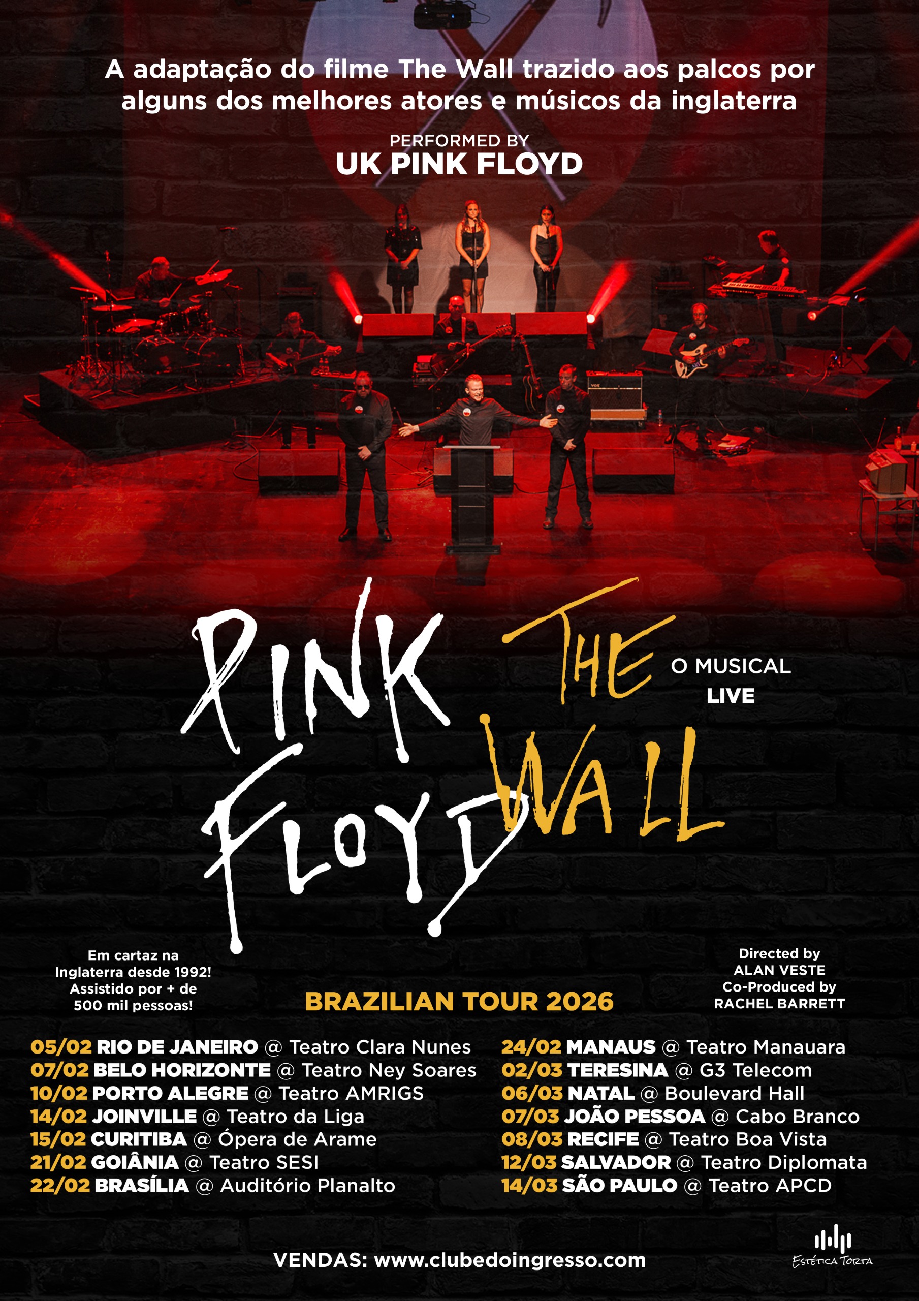 Aclamado internacionalmente, o musical The Wall, inspirado no clássico álbum conceitual do Pink Floyd, volta aos palcos brasileiros entre fevereiro e março de 2026. A produção é conduzida pelo grupo britânico Pink Floyd UK e dirigida por Alan Veste, com coprodução de Rachel Barrett. Em Curitiba, o espetáculo está marcado para o palco da Ópera de Arame no dia 15 de fevereiro. Os ingressos estão à venda no site do Clube do Ingresso.