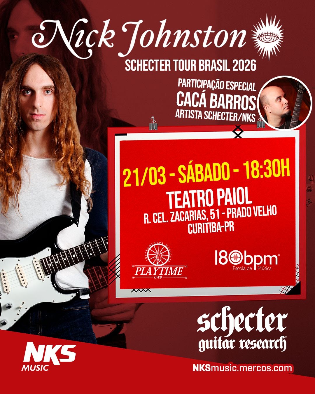 No dia 21 de março, o guitarrista canadense Nick Johnston, que atualmente integra o Mastodon, desembarca em Curitiba para um workshow — formato intimista e exclusivo que oferece ao público uma imersão em seu processo criativo. A apresentação contará ainda com a participação especial do guitarrista Cacá Barros e acontece no Teatro Paiol, em uma realização conjunta da Escola de Música 180BPM com a loja Playtime CWB.