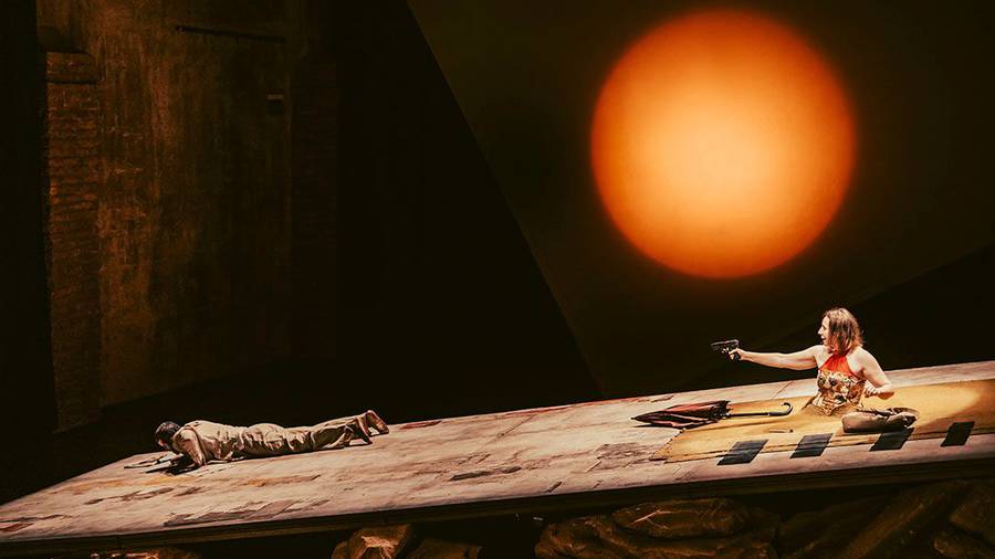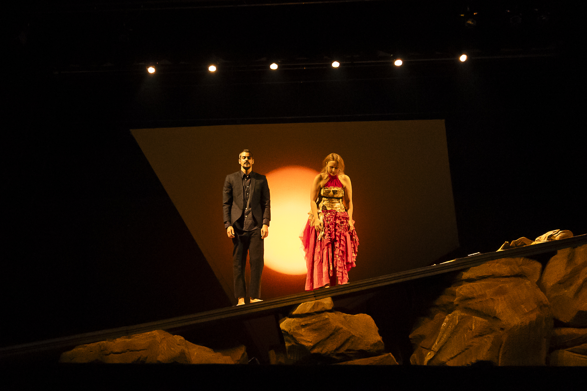 Inserida na Mostra Lúcia Camargo, eixo central e curatorial do Festival de Curitiba, a montagem de Dias Felizes, dirigida por Paulo de Moraes, vem do Rio de Janeiro com uma encenação bastante visual. A peça se inicia com um cenário árido e rochoso, praticamente um deserto, e ao fundo um sol laranja e escaldante.
