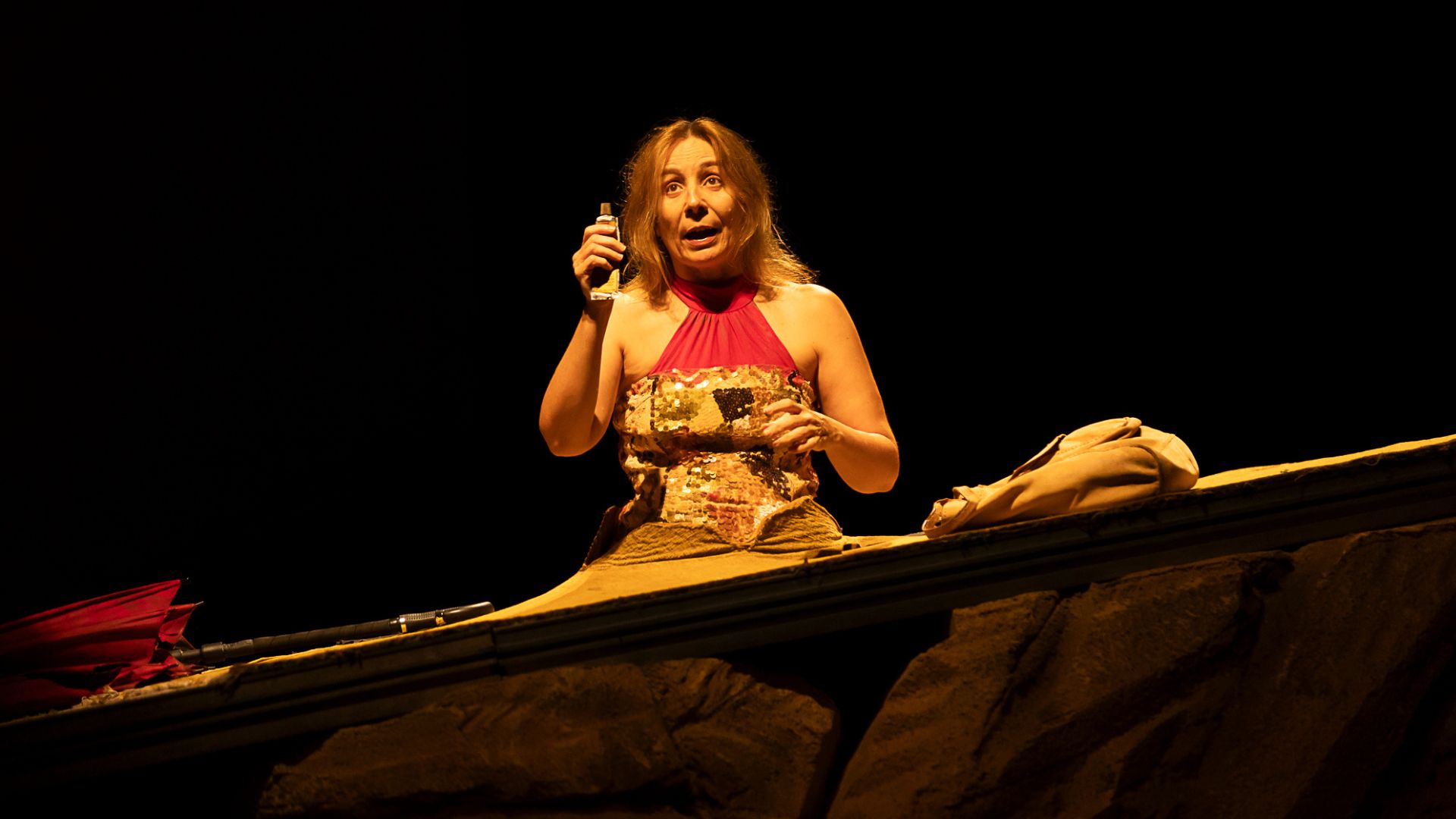 Inserida na Mostra Lúcia Camargo, eixo central e curatorial do Festival de Curitiba, a montagem de Dias Felizes, dirigida por Paulo de Moraes, vem do Rio de Janeiro com uma encenação bastante visual. A peça se inicia com um cenário árido e rochoso, praticamente um deserto, e ao fundo um sol laranja e escaldante.