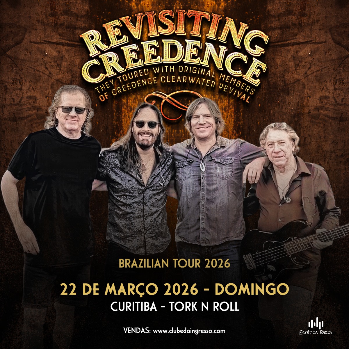 Entre março e abril de 2026, vinte cidades brasileiras receberão o Revisiting Creedence, grupo liderado pelo vocalista Dan McGuiness e pelo guitarrista Kurt Griffey que celebra o imortal trabalho do Creedence Clearwater Revival, um dos maiores ícones do southern rock. Em Curitiba, a apresentação está marcada para o dia 22 de março, no palco do Tork n’ Roll. Os ingressos estão à venda no site do Clube do Ingresso e custam a partir de R$125.