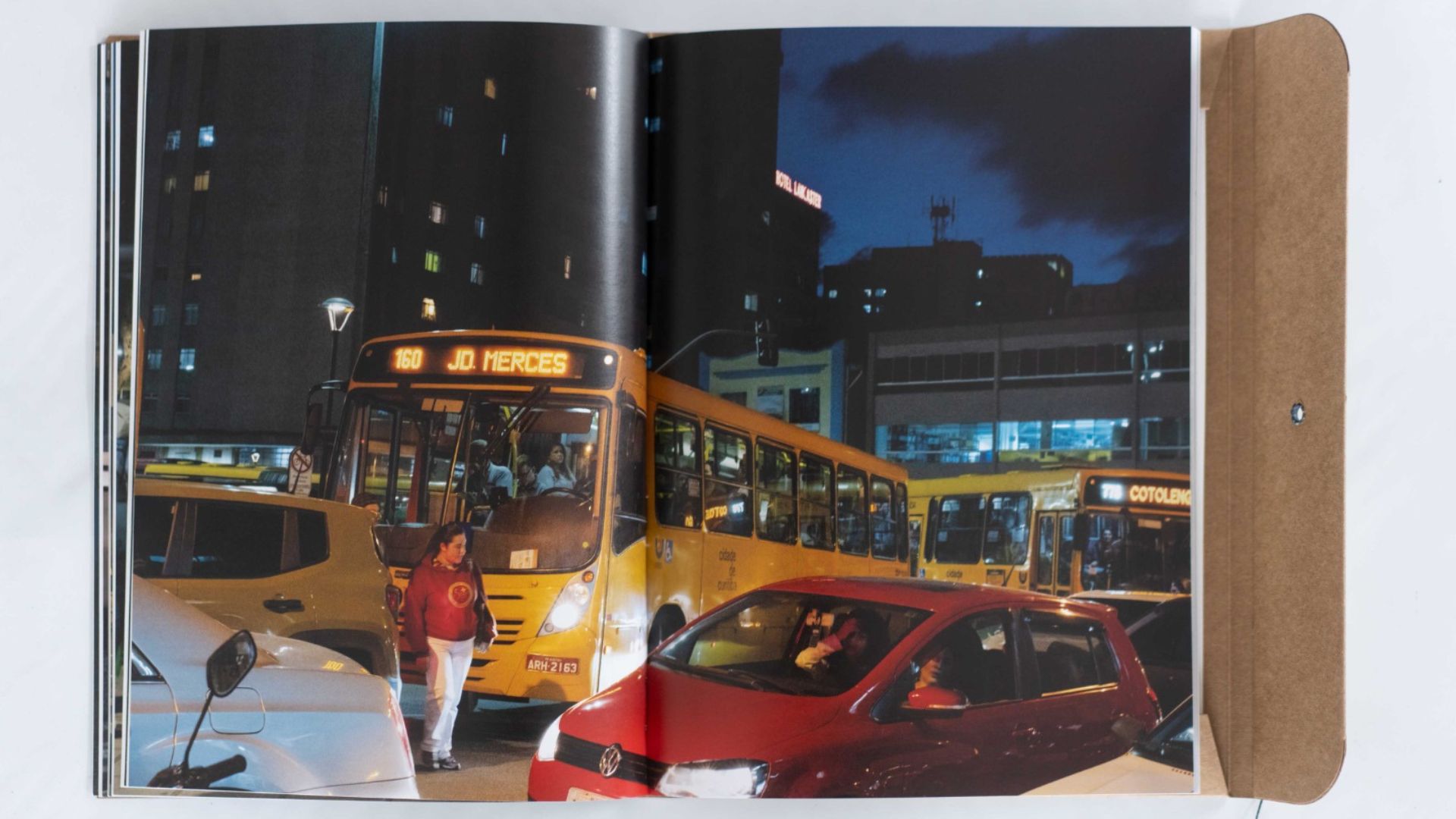 As imagens expostas e impressas no livro registram cenas típicas desse horário, com filas em pontos de ônibus, pedestres, vendedores, trabalhadores que encerram o expediente, estudantes e transeuntes, compondo um retrato coletivo da cidade em movimento.